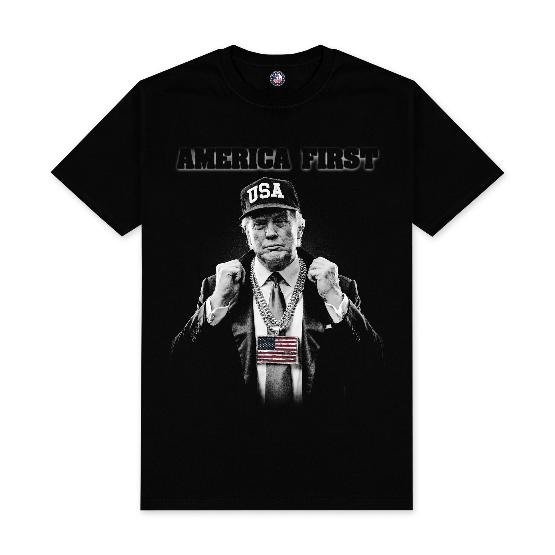 Make a bold statement with our America First Trump Shirt, designed exclusively for proud American patriots and conservative supporters of Donald Trump. Featuring a powerful graphic of Trump confidently sporting a USA hat and an American flag chain, this t-shirt clearly emphasizes your patriotic values.